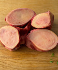 Märgben är en riktig delikatess – fyllda med krämig märg som smälter vid tillagning och ger en djup, rund smak. Perfekta att rosta i ugn och servera som förrätt med rostat bröd, eller att koka med i buljong och långkok för extra fyllighet och näring.