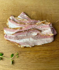 Ett tunt skivat, varsamt saltat och rimmat sidfläsk med fin balans mellan sälta, rökighet och köttsmak. Hantverksbaconet är tillagat utan nitrit, konserveringsmedel eller E-nummer – precis som bacon ska smaka på riktigt.
